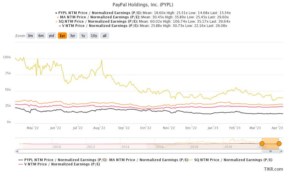 PYPL, SQ, V, & MA 1Y P/E Valuations