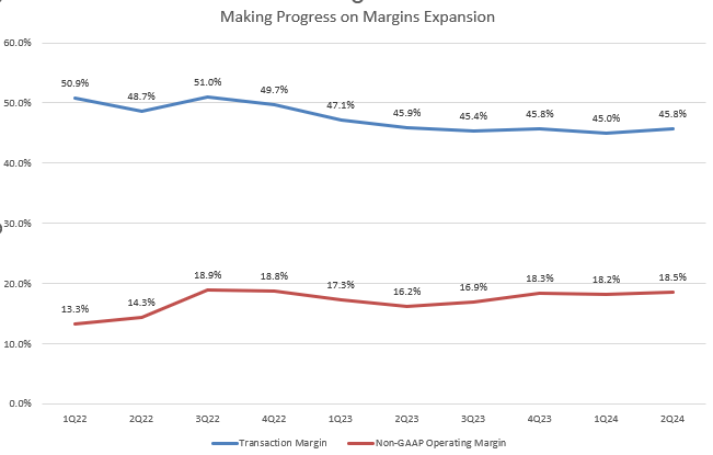 As mentioned in my previous analysis, PYPL has been actively managing its cost structure since FY2023. While the company remains focused on transaction revenue growth, it’s encouraging to see that its transaction margin has improved to 45.8% from the previous quarter. Additionally, the non-GAAP operating margin has significantly increased by 230 bps compared to a year ago, driven by 1% decline in non-transaction-related operating expense.