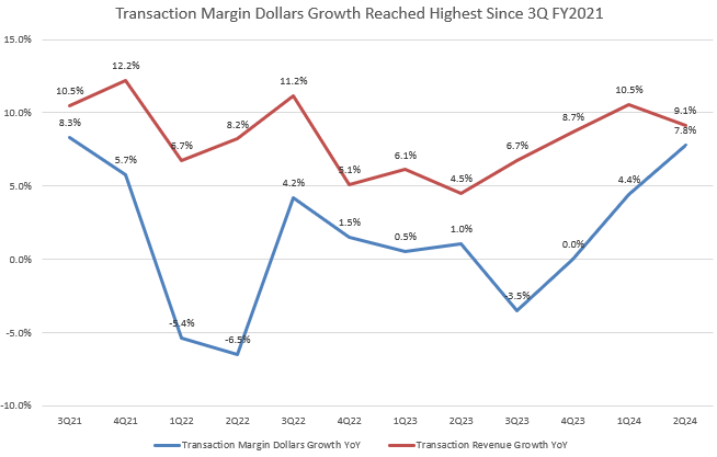 Due to higher interest charges, Braintree, Branded Checkout, and Venmo have significantly contributed to a rebound in transaction revenue growth over the past few quarters. PYPL’s transaction revenue grew 9.1% YoY, a significant increase compared to the 4.5% YoY growth in 2Q FY2023. More importantly, the growth of transaction expenses has decreased to 11.3% YoY in the last quarter, down from 16.3% YoY in 2Q FY2023. Meanwhile, its transaction and loan losses dropped 16% YoY last quarter, following a 27% YoY decline 1Q FY2024. This led to an 7.8% YoY increase in transaction margin dollars (total revenue minus transaction expense and loan losses), marking the fastest growth since FY2021.