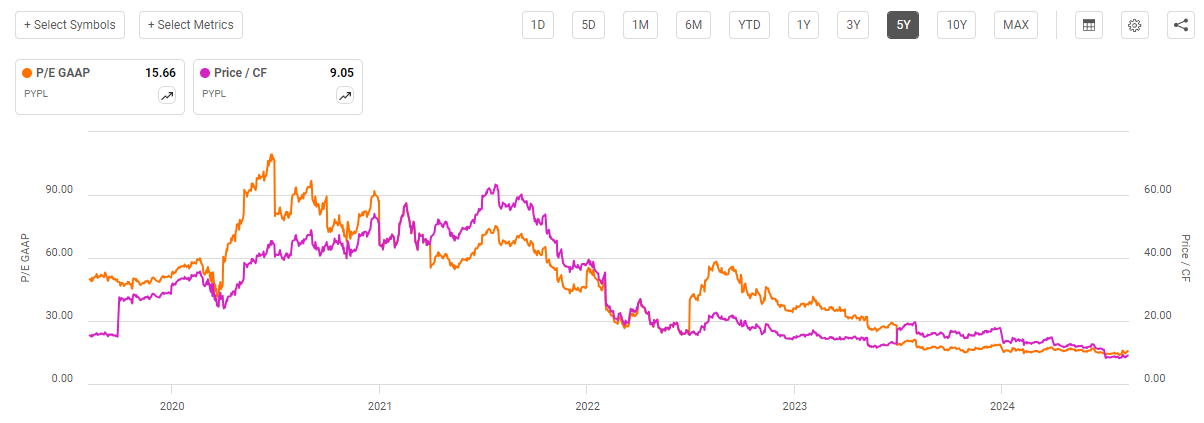 As shown in the chart, PYPL is currently trading at an appealing valuation, positioning it as a value stock. Given its value-oriented nature, it’s understandable that the stock has been underperforming broader indexes, which have been fueled by strong growth optimism driven by the GenAI boom. PYPL’s GAAP P/E and P/OCF are at their five-year lows, suggesting that investors are currently undervaluing its earnings and cash flow growth. Considering the company’s FY2024 non-GAAP EPS guidance of “low to mid-teens,” the adjusted P/E sits around 14.7x to 15x, below Block, Inc.’s (SQ) 17.6x, making it highly attractive for long-term investors. Therefore, I remain strategically long on PYPL, even though I don’t anticipate a significant rebound in top-line growth in the near term.