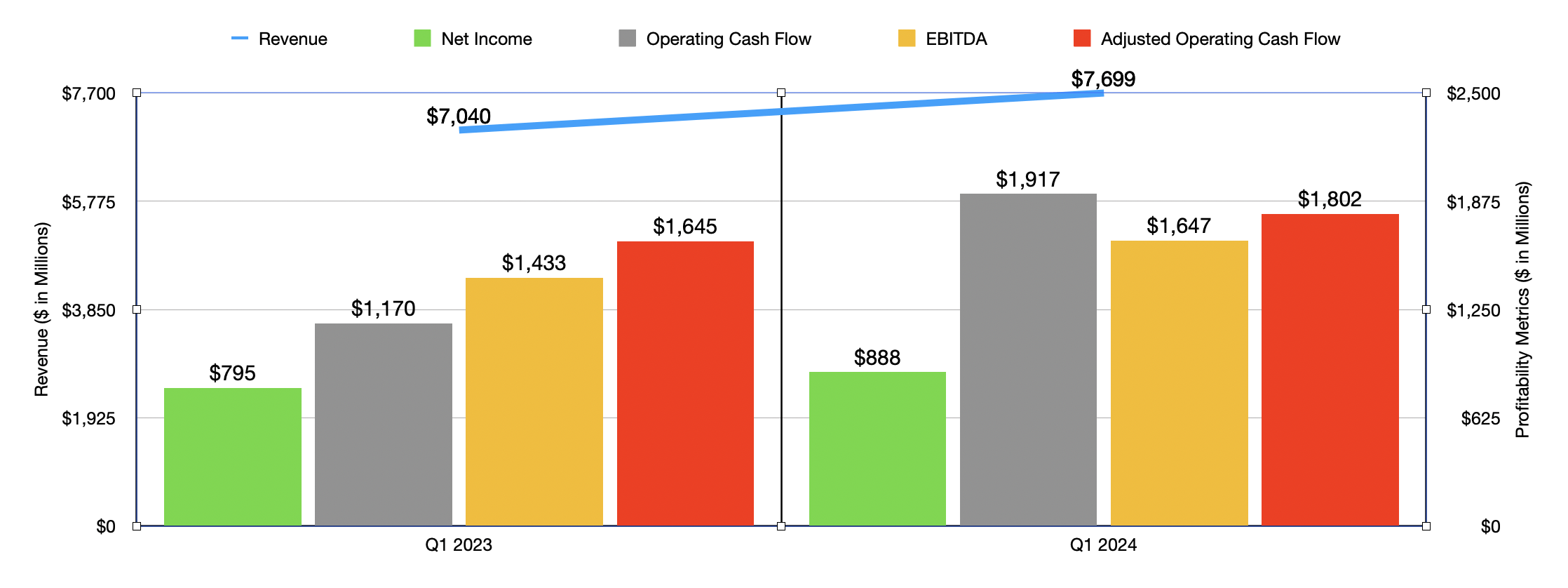 When it comes to the 2024 fiscal year in its entirety, management did say that adjusted earnings per share will rise somewhere between the mid to high single-digit range. Unfortunately, this doesn’t tell us much about total profitability because of two factors. First, the company did change how it calculates adjusted earnings per share recently. But more importantly, management is very active in buying back stock. During the first quarter alone, the firm bought back $1.5 billion worth of shares, leaving a hefty $9.4 billion remaining under the firm’s current share authorization plan.