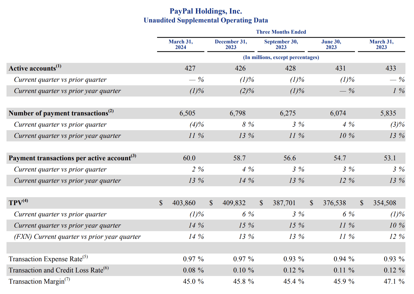 What I found particularly interesting was that PayPal finally saw an uptick in the number of active accounts using its services. You see, in the first quarter of 2023, the firm had 433 million active accounts. This metric fell in each of the subsequent quarters, bottoming out at 426 million active accounts at the end of last year. But finally, in the first quarter of this year, the company saw a modest improvement, with the number of active accounts inching up to 427 million. The consecutive quarterly declines in active account numbers is the one thing that gave me pause about the business. So to see some stabilization here is most certainly encouraging.