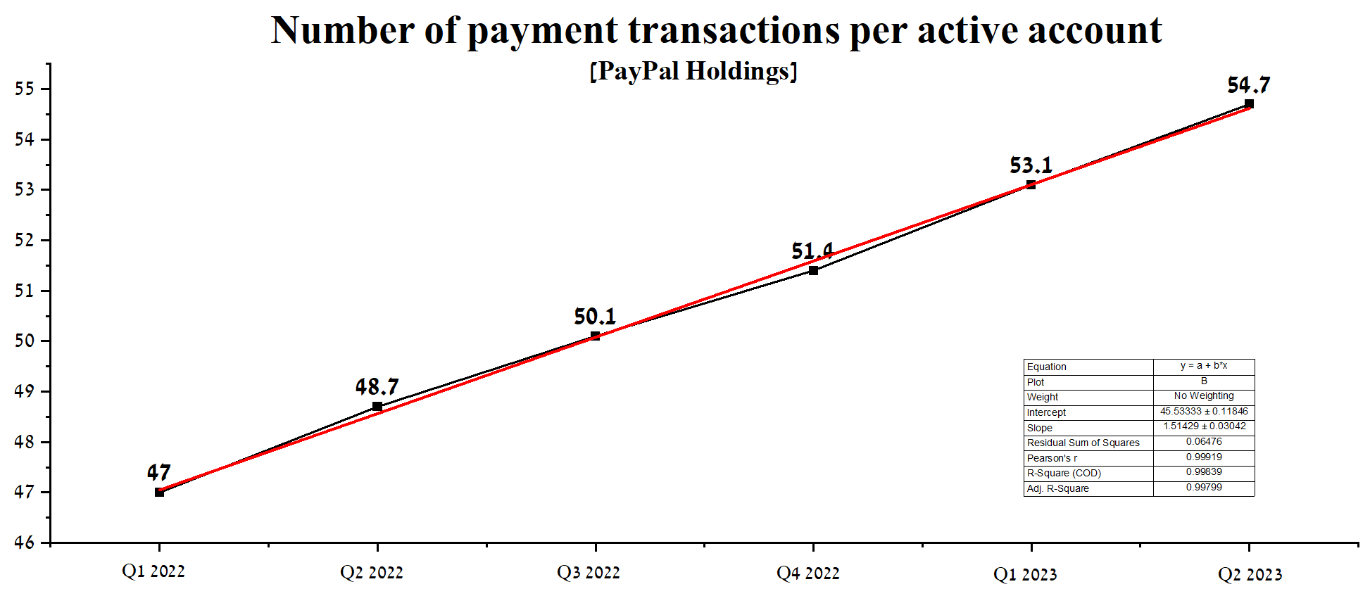 However, the main negative point in the financial report for the second quarter of 2023 was the decrease in the number of active accounts for the second quarter in a row. At the end of June, there were 431 million active accounts, down two million QoQ and five million below our expectations. On the other hand, such an equally important indicator as the number of payment transactions per active account continues to set new records. According to the results of the second quarter of this year, this indicator continued its steady linear growth reaching 54.7, which represents an increase of 12.3% compared to the previous year.