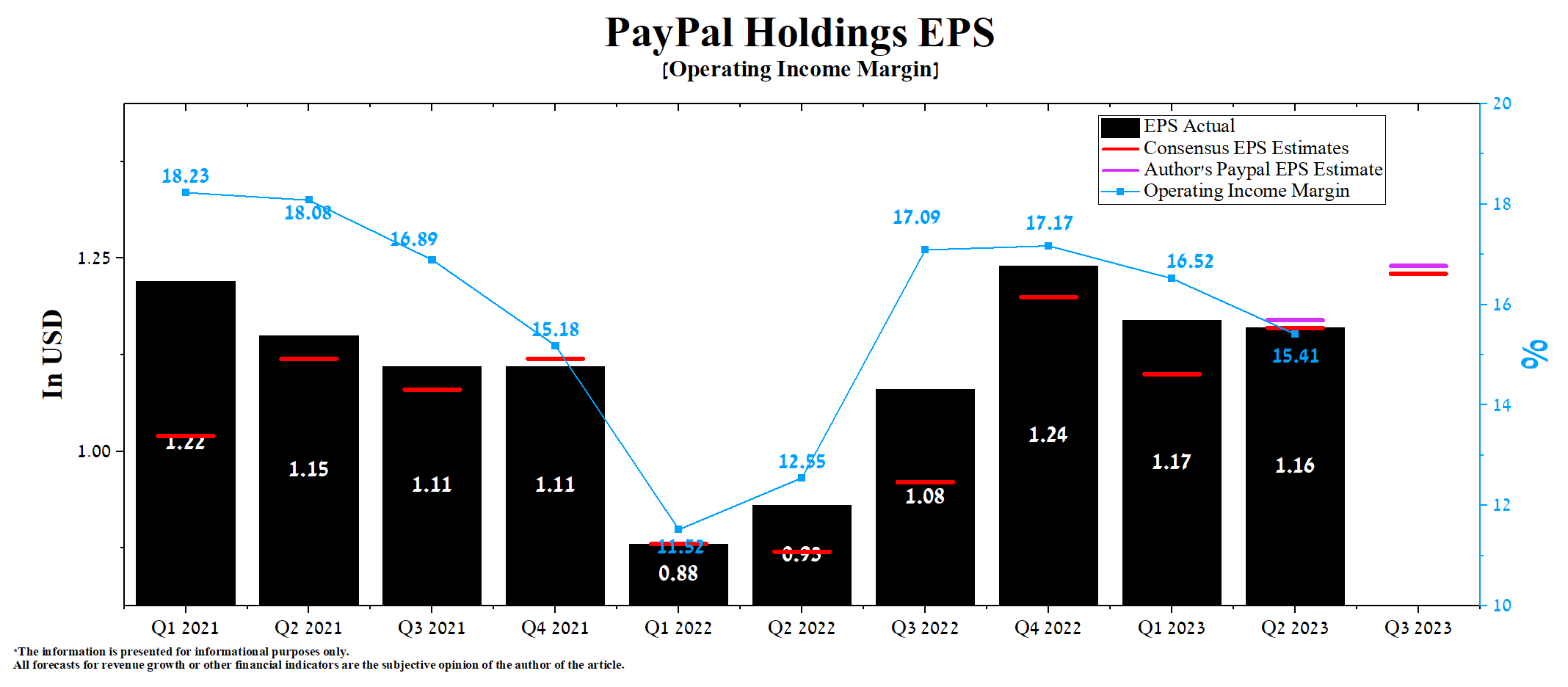 According to Seeking Alpha, PayPal’s Q3 EPS is expected to be $1.23, up 6% from the consensus estimate for Q2 2023. At the same time, according to our model, PayPal’s EPS will be $1.24, up 14.8% from the previous year.