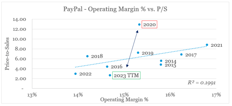 As of the time of this writing, the tables have turned rapidly and PYPL is now priced at the other end of the spectrum – at an extremely low sales multiple relative to its current operating margin.