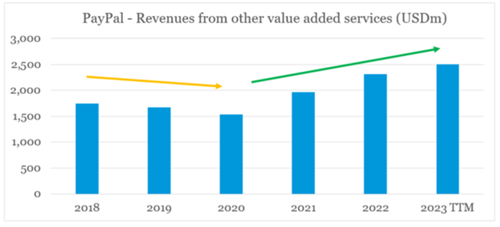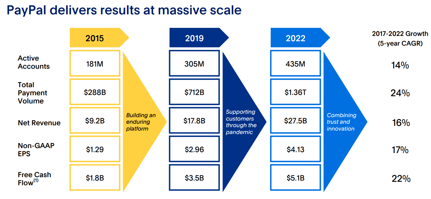 A period of flat to declining active accounts is also to be expected as PayPal has experienced a long period of very high growth in active accounts, adding roughly 130m from 2019 through 2022.