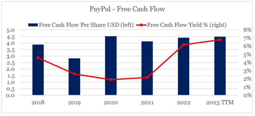 Lastly, we’ll have a look at PayPal’s free cash flow per share, which has been relatively flat over the past few years. Nevertheless, the company’s free cash flow yield of nearly 7% is now significantly higher than the average of 2% during the 2020-21 period.