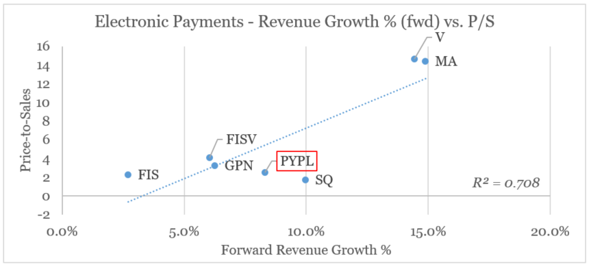 Relative to its peers in the digital payments space, PYPL also appears very attractively priced once we control for each of the company’s forward revenue growth rate (plotted on the x-axis).