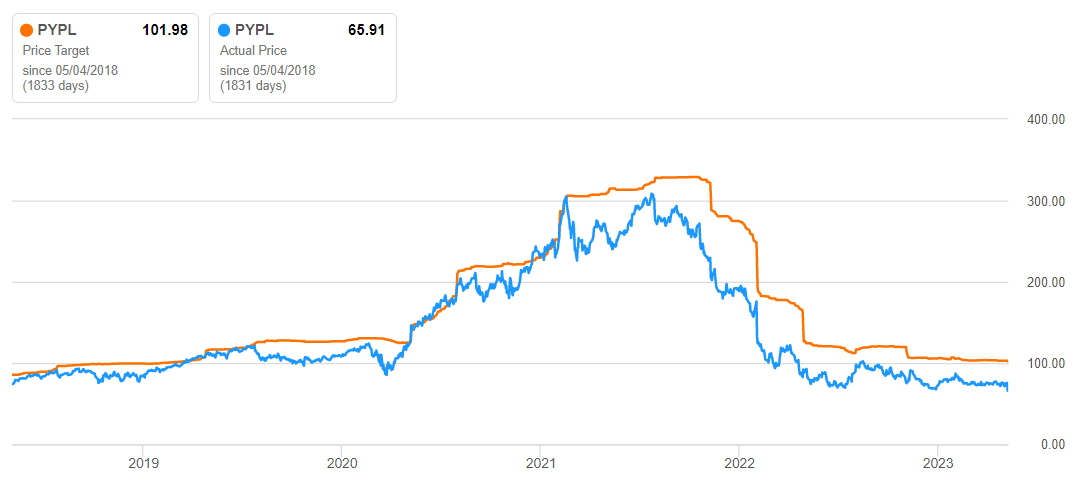 Although equity analysts are very good at pinpointing operational issues within a business, their track record of identifying long-term trends or temporary inefficiencies within the market is very poor. A clear illustration of that is the graph below, which shows that the consensus price target of PYPL simply follows the actual price with a bit of a lag.