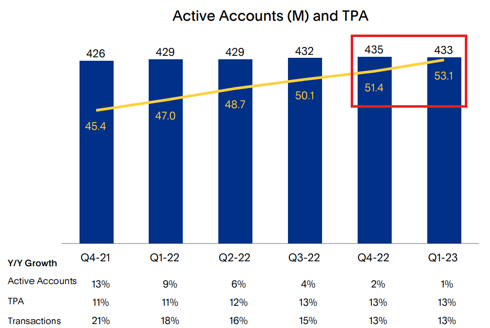 Another major issue during the quarter was the fact that active accounts fell to from 435m to 433m in the past 3 months. Although these headwinds are likely to persist in the short-run, the long-term impact is mostly speculative. Moreover, transactions per account continued to improve which supports the management’s claim that they are prioritizing high-value accounts.
