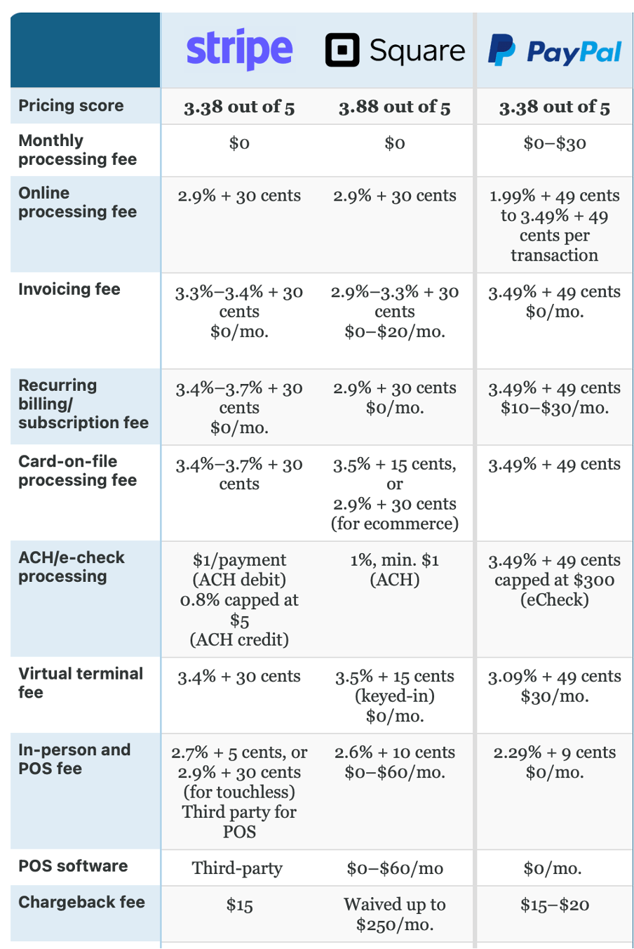 Comparison of Stripe, Square, PayPal (Source: Fit Small Business)