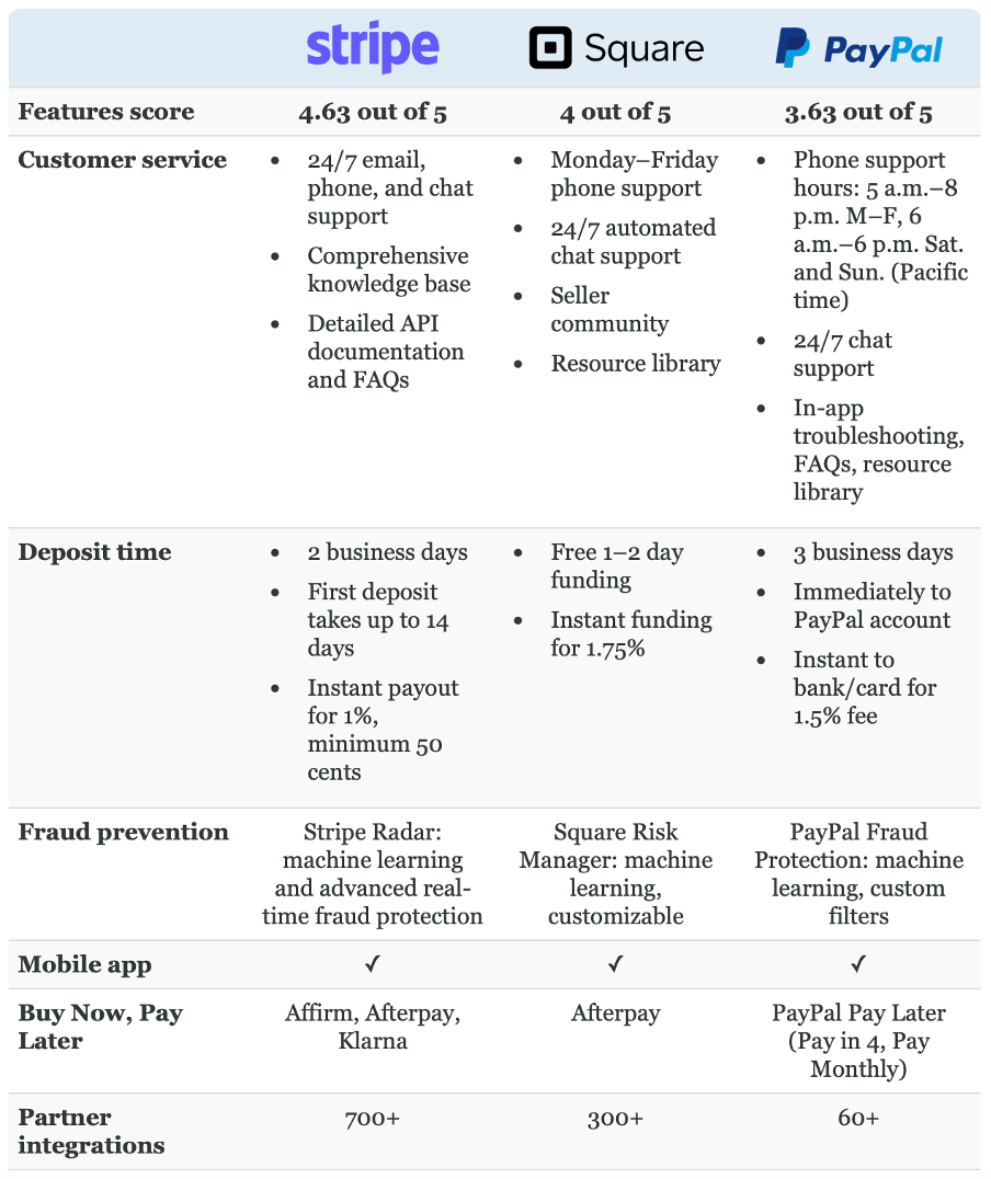 Features comparison Stripe, Square and PayPal (Source: Fit Small Business)