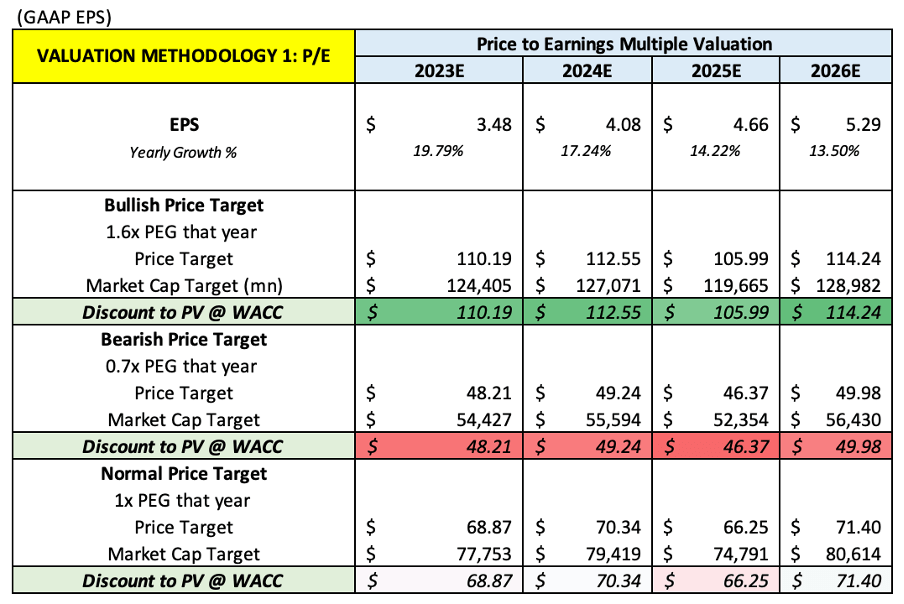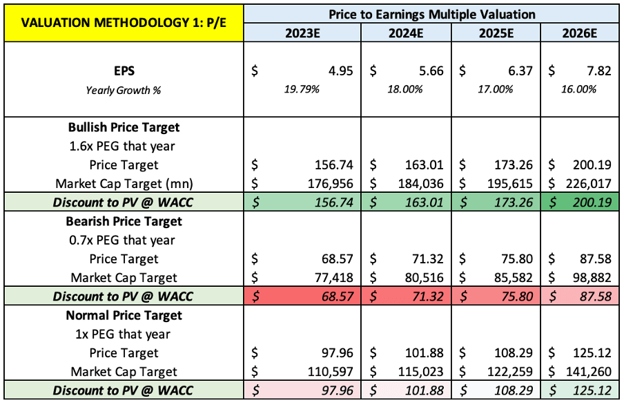 Based on the P/E valuations, the share price estimates range from $68 to $156, with the most likely scenario pointing to a share price slightly below $100.