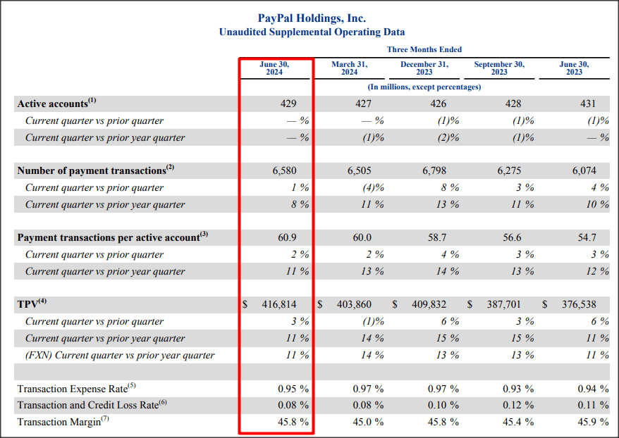 PayPal (NASDAQ:PYPL) reported strong Q2’24 results last week that showed growth in accounts, double-digit growth in transactions per active account, as well as 31% Y/Y growth in the important free cash flow metric. The payment processing platform also generated high-single digit top line