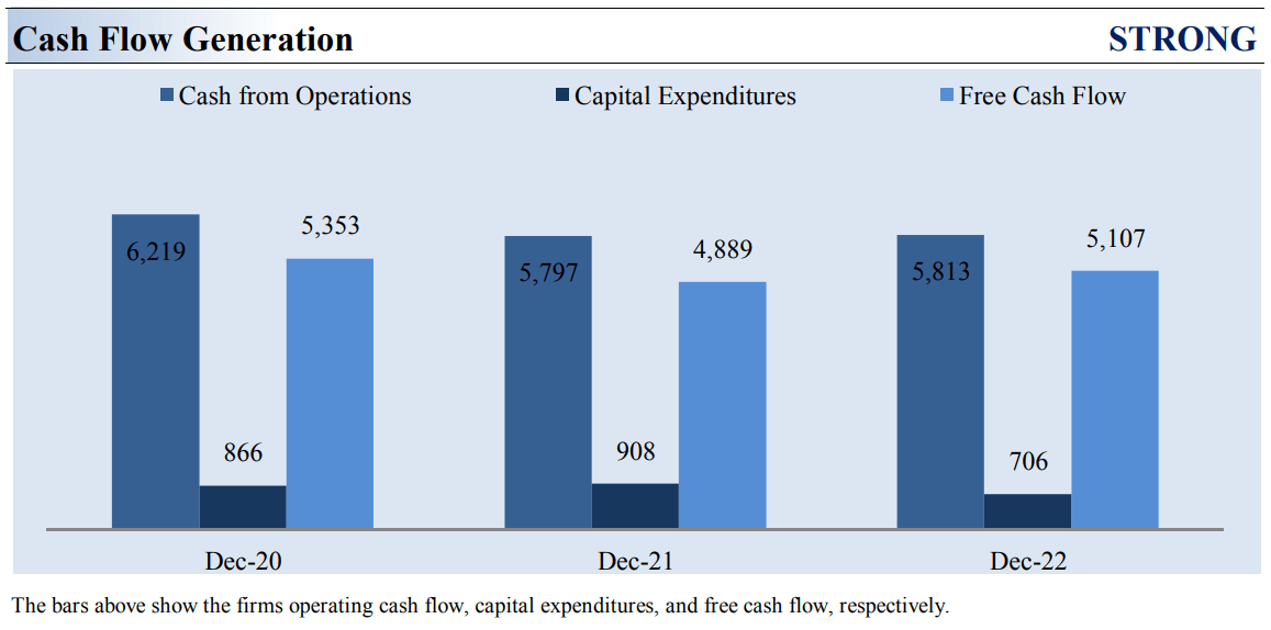 Stocks that generate a free cash flow margin (free cash flow divided by total revenue) above 5% are usually considered cash cows. PayPal’s free cash flow margin has averaged about 20.9% during the past 3 years. Frankly, this is awesome, and as such, we rate PayPal’s cash flow generation as STRONG. The free cash flow measure shown above is derived by taking cash flow from operations less capital expenditures and differs from enterprise free cash flow [FCFF], which we use in deriving our fair value estimate for the company. At PayPal, cash flow from operations decreased about 7% from levels registered two years ago, while capital expenditures fell about 18% over the same time period.
