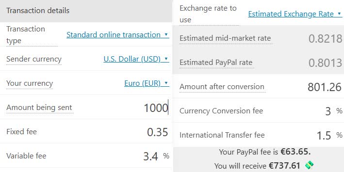 To put it in perspective, if someone in the eurozone receives a $1,000 payment in USD, above is the calculation displaying how much less he would end up after taking into account PayPal’s fees.