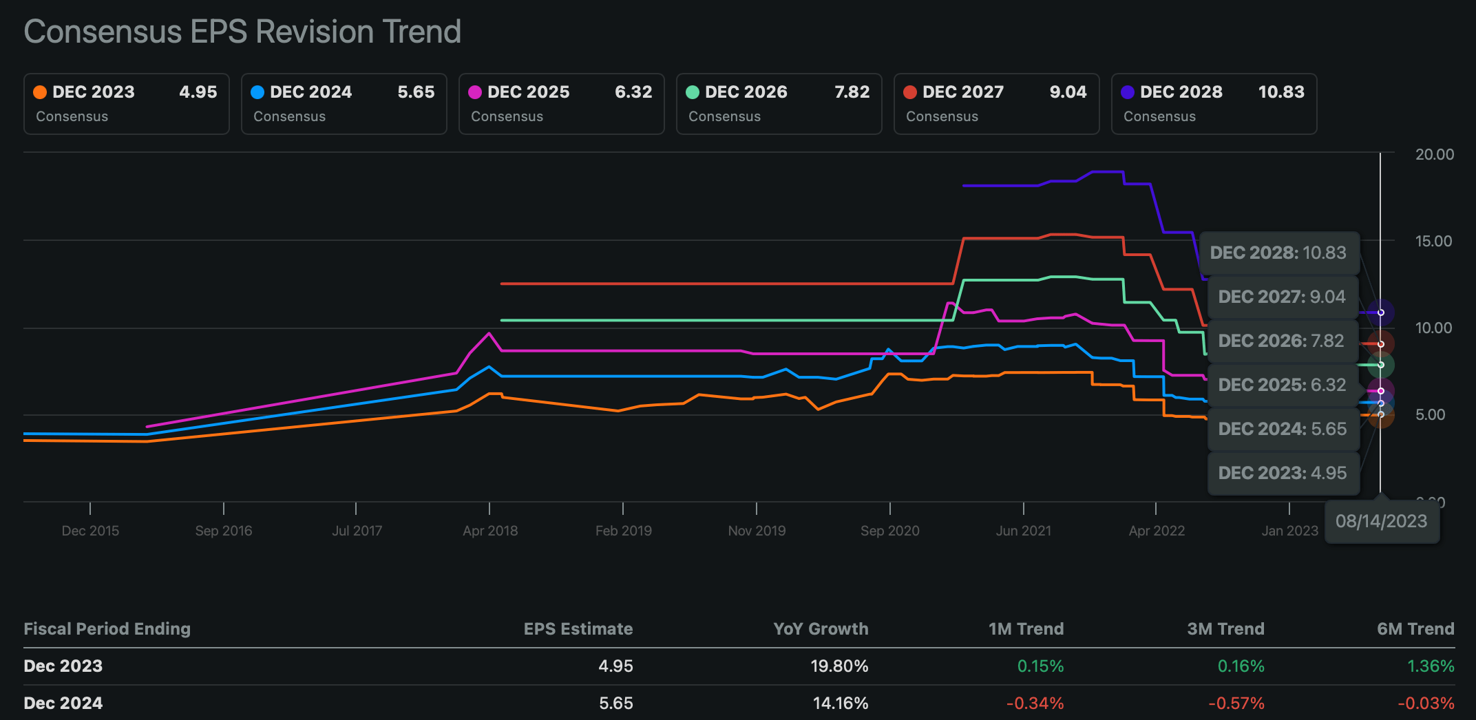These aren’t the trends of a stock that should be in the heap. Analysts are mostly unchanged because the business is mostly unchanged. Estimates for this year continue to rise while out-years are mostly flat.