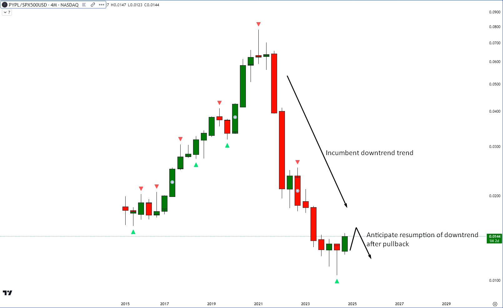On the 4-monthly (multi-quarter) charts, PYPL vs SPX500 is still in an incumbent downtrend. There is some basing going on recently that has paused further declines. However, my technical analysis interpretation suggests that another leg down can be expected as the ratio prices react off the sellers’ supply area.