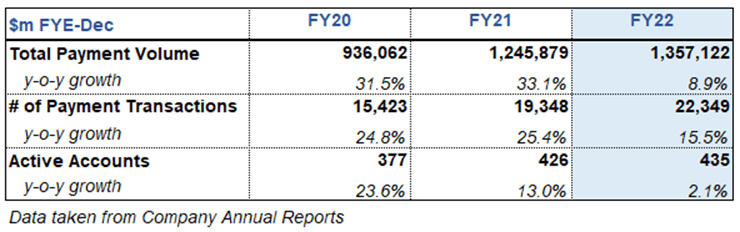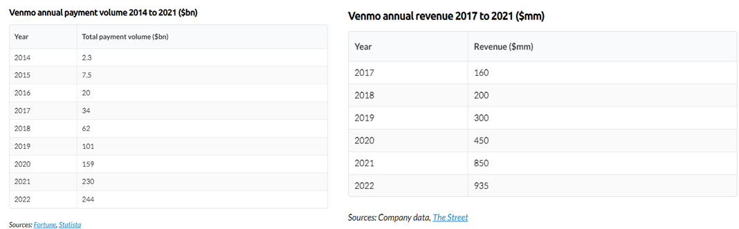 Since 2015 Venmo has seen its total payment volume increase by 106 times to an outstanding $244 billion in 2022, further to this, it has increased its revenues from $160 million to $935 million in 2022 (Please refer to the tables below). These are truly explosive numbers that will be difficult to emulate in the future, however, Venmo remains on its growth path, and we could continue seeing growth for several years.