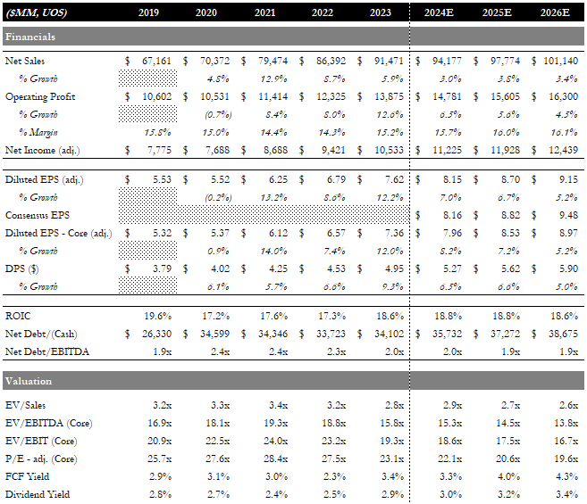 Our $151 target price implies a forward P/E of ~19x, a modest ~5% discount to the long-term average, and is based on a 10Y DCF model. We assume a 7.5% WACC, ~4% post-currency sales growth, ~17% operating margin in year 10 and ROIC of ~19%. This equates to ~19x forward P/E with a ~3% yield and implied return of -8%. We maintain our Sell rating.