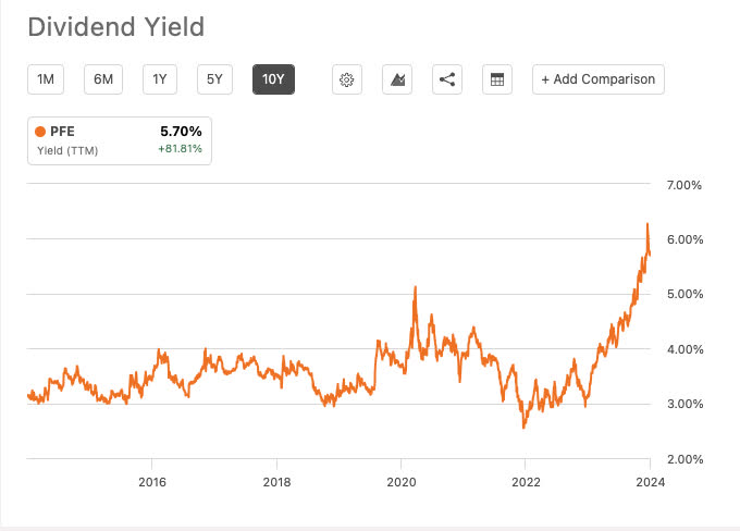 Buying Pfizer at this level will get you a decade-high dividend yield. The company recently continued to raise its dividend despite the free cash flow situation. This means Pfizer is willing to finance the dividend, at least for the time being, with existing balance sheet solutions until free cash flow recovers.