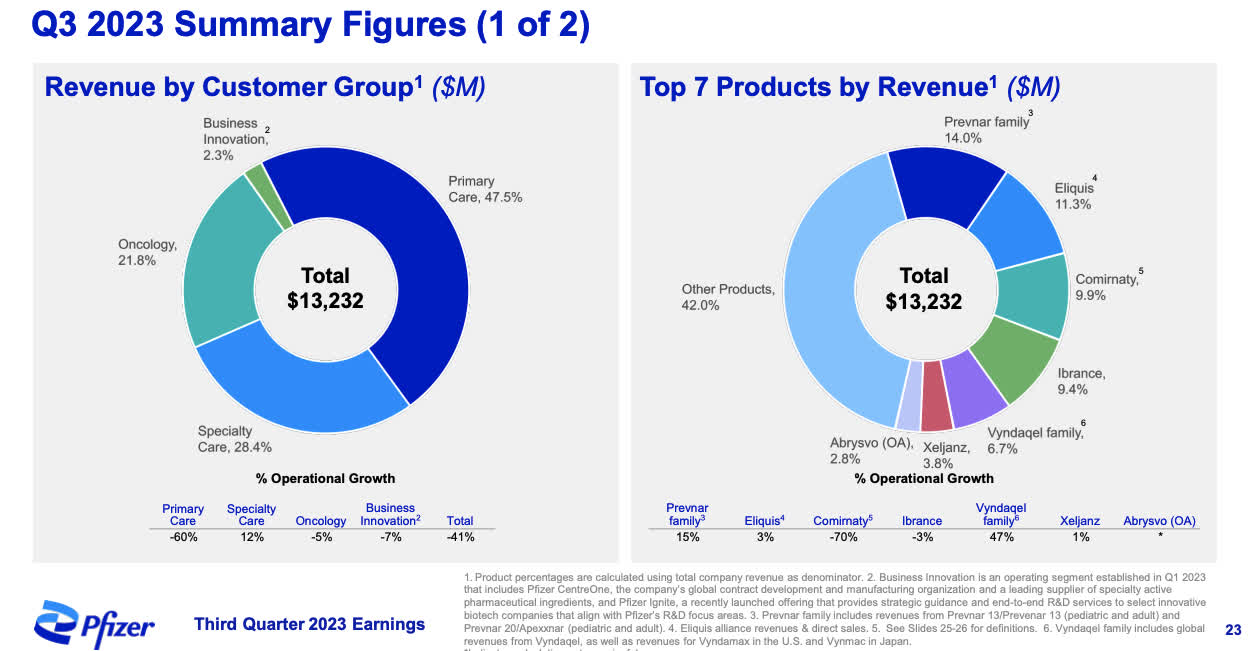 Pfizer had 52 reportable revenue-generating items in Q3 2023 amongst 4 segments. At times Pfizer gets lumped into Moderna comparisons because of the COVID-19 vaccine sales. The two companies couldn’t be more different from a revenue diversification standpoint.