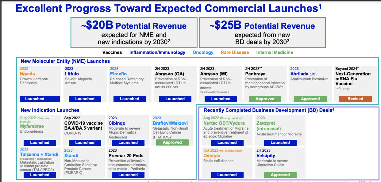 As we’ll see below, with the closure of the Seagen deal, Pfizer is putting a lot into M&A for growth purposes. With an expected $20 Billion in potential revenue growth for new molecular launches and $25 Billion from new Business Development deals by 2030, there is ample expected future growth in the pipeline. The above Q3 presentation was put out before the closure of the Seagen deal.