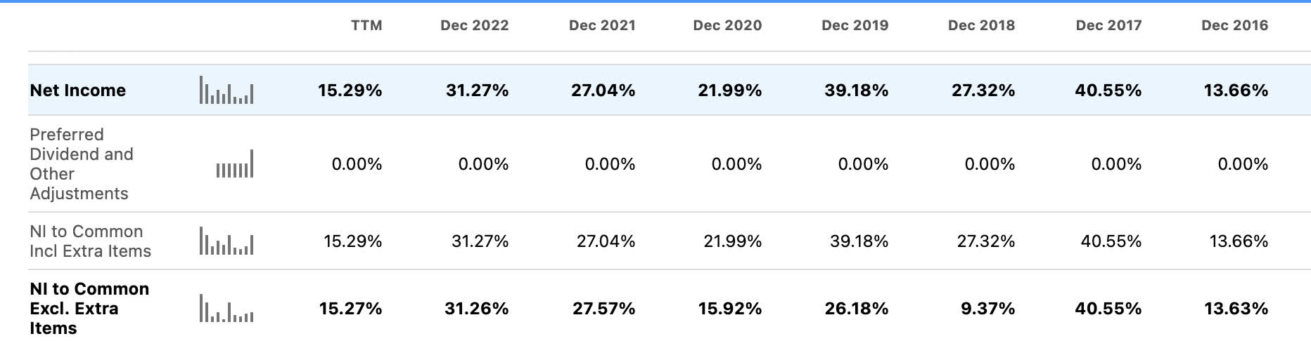 Once again borrowing from the Peter Lynch ethos, comparing the 10-year growth in earnings to the price appreciation shows quite a divergence. This stock was generally beloved enough in the past decade to have price appreciation trending above earnings growth every year until 2023. The huge pullback now presents us with a company that has grown earnings 73% over the decade while price growth is only at 3.15%. This is indicative of value.