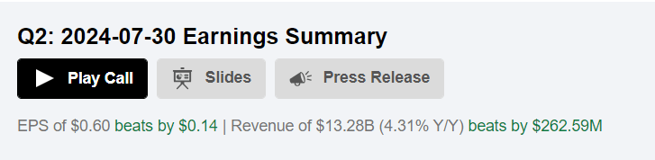 The company reported revenue of $13.28 billion and earnings per share of $0.6 (adjusted), beating market consensus estimates by 2.02% and 30.19%, respectively, according to Seeking Alpha: