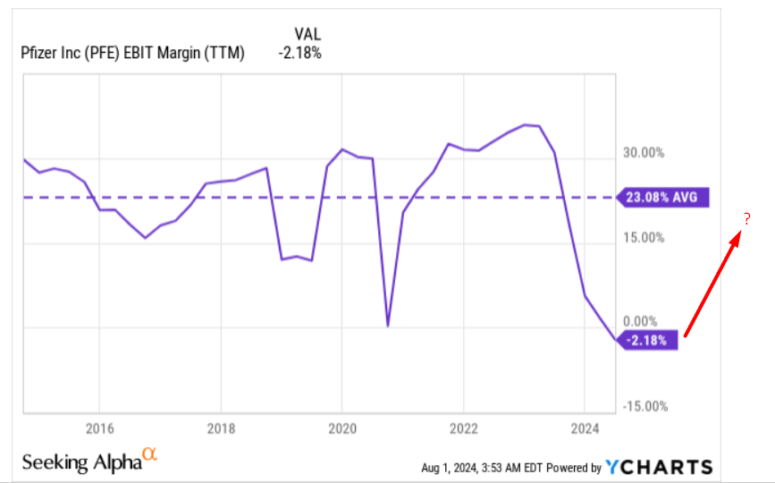 What I liked in Pfizer’s Q2 results was the rise in margins. The adj. gross margin improved to 79% from 76% thanks to favorable non-COVID revenue mix and cost management, as the management commented during the earnings call. A positive difference of 300 basis points is a very big achievement for any company, in my opinion. At the same time, the operating expenses increased by just 5% YoY; that is, in general, adjusted for individual one-off items, the cost control seems to get better. The management keeps working on their recently announced Manufacturing Optimization Program, which together with their cost realignment program is targeting Pfizer’s pre-pandemic EBIT margins (on a mix-adjusted basis excluding Comirnaty). As the earnings press release clarified, Pfizer is on track to deliver at least $4 billion in net cost savings by the end of 2024, and judging by how it has gone since the beginning of 2024, I think the $4 billion may be the low of the range we should expect. If the qualitative growth in the Oncology and Specialty Care segments continues, we can therefore speak of a potential EBIT margin of at least 15-20% by the end of 2025, which is close to the ten-year average.