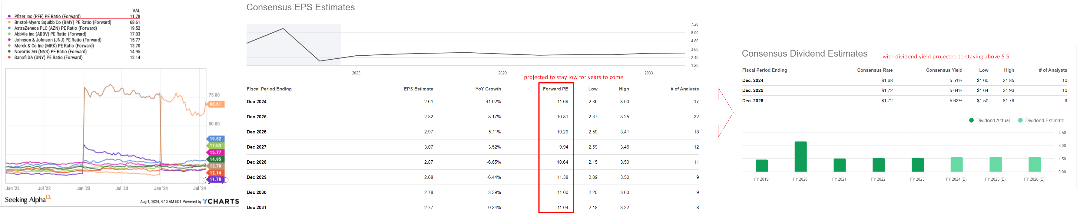 Yes, Pfizer is clearly lagging behind many other peers in terms of margin stability in the recent past (and due to modest growth rates). But these points can hardly logically explain the current picture: The company trades at only 11 times projected earnings and still has a lot of inefficiencies to work on in the foreseeable future, and Wall Street analysts are giving very modest EPS growth projections for the next few years. The implied P/E ratio will be 10.5x in 5 years, which is very low. In my opinion, a fair valuation of PFE stock is at least 15x, which is the historical norm at pre-COVID margins that management is targeting today and the consensus still doesn’t believe in. At the same time, the dividend yield should be above 5.5% over the next few years, which is 100-150 basis points above the company’s average of the last 5 years. In my opinion, all this shows that PFE shares are highly undervalued today.