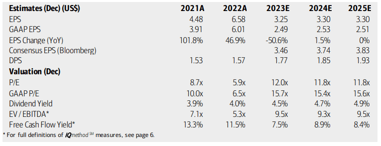 On valuation, analysts at BofA see earnings falling sharply from 2022’s abnormally high per-share profit total. Nero-zero percent annual bottom-line growth is expected over the coming quarters as EPS normalizes. The Bloomberg consensus forecast is a bit more sanguine, though. Dividends, meanwhile, are seen as rising steadily amid ample free cash flow despite soft profit growth.