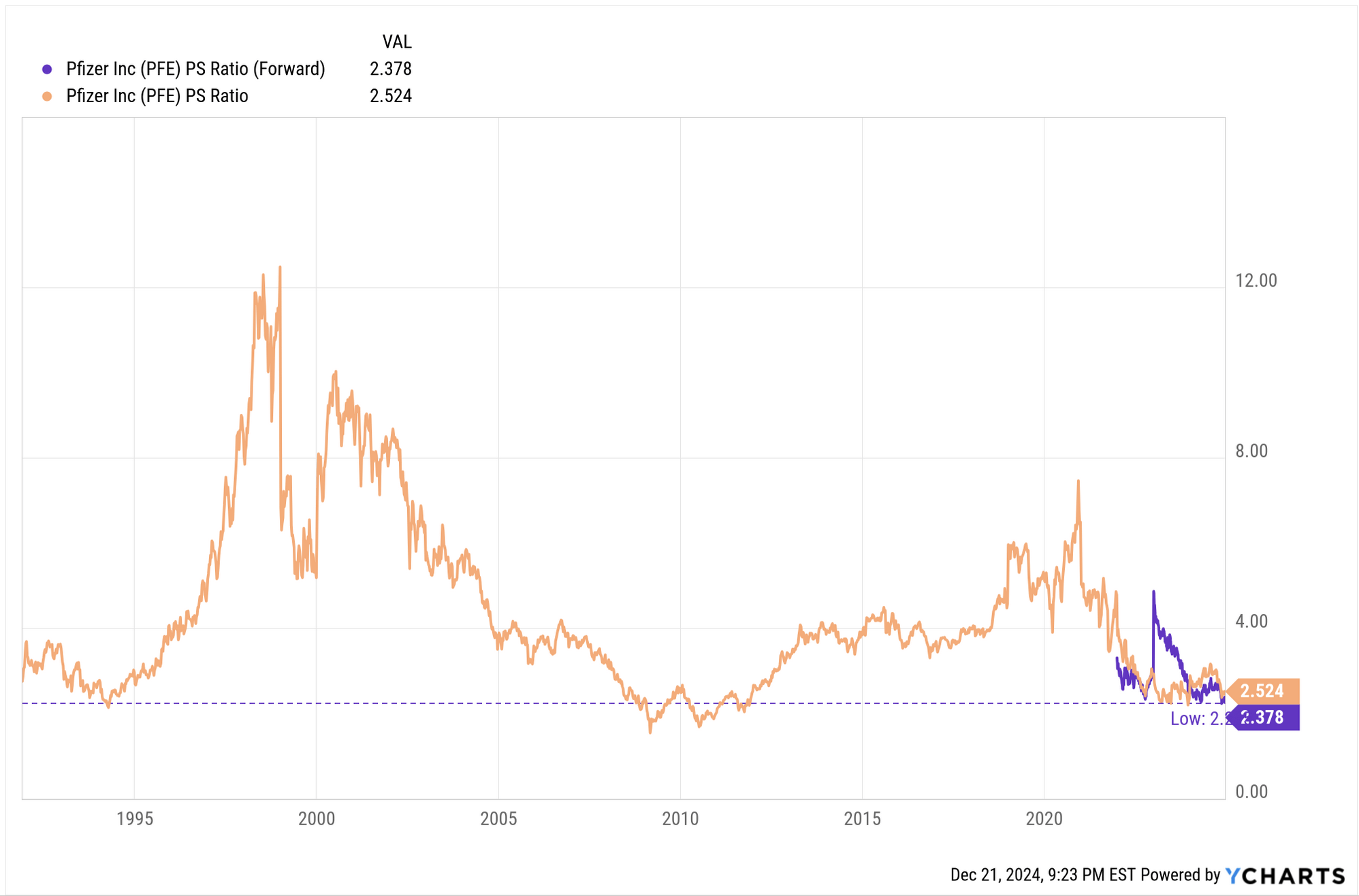 Exhibit B: Pfizer’s stock trades at just 2.4x forward sales, closer to its multi-decade sales valuation lows. (YCharts)