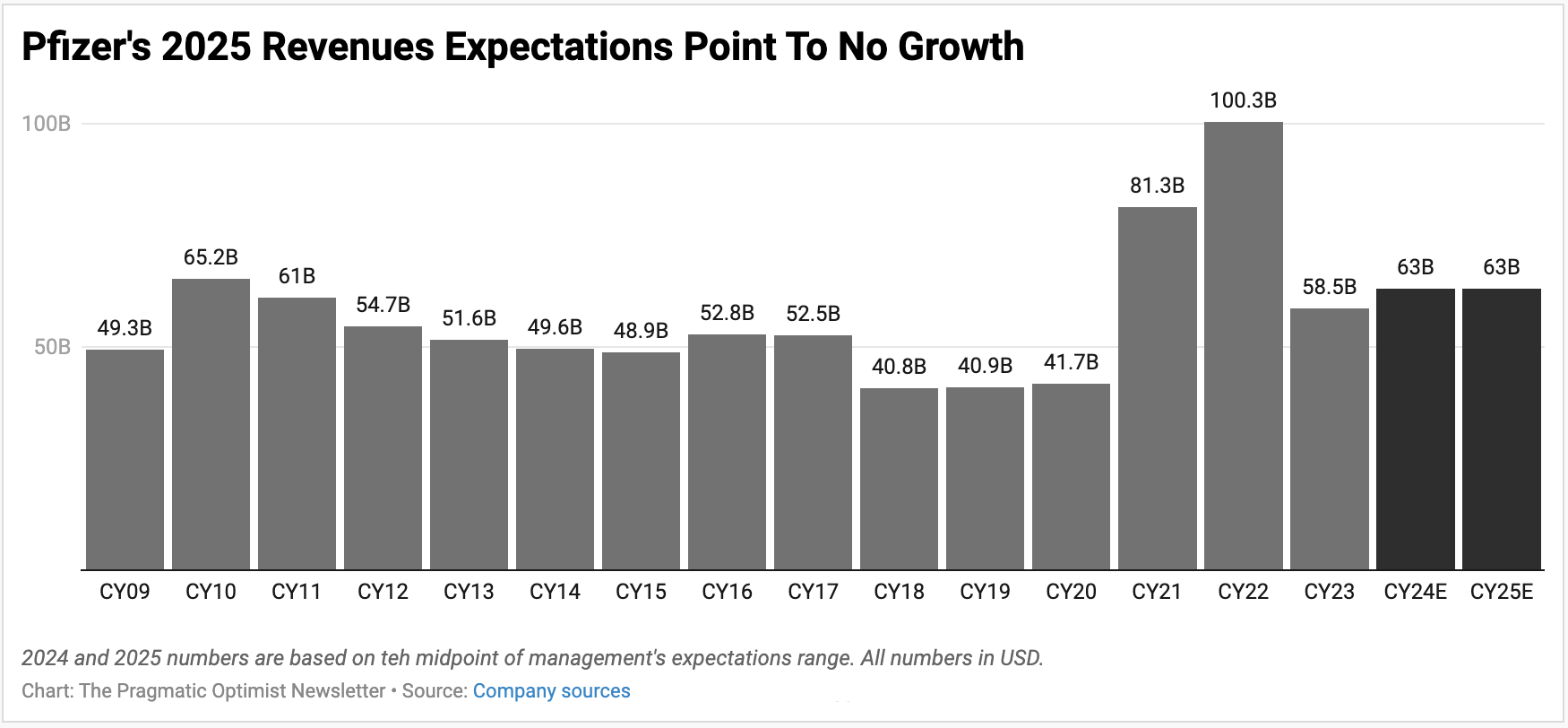 Pfizer’s management aimed to change some of that sentiment by issuing its updated 2025 guidance last week. The guidance called for 2025 sales to be in the range of $61-64 billion, which points to sales being flat in 2025. The forward guidance by management calls for a much more stable revenue base, lapping the last two years of volatile COVID revenues.