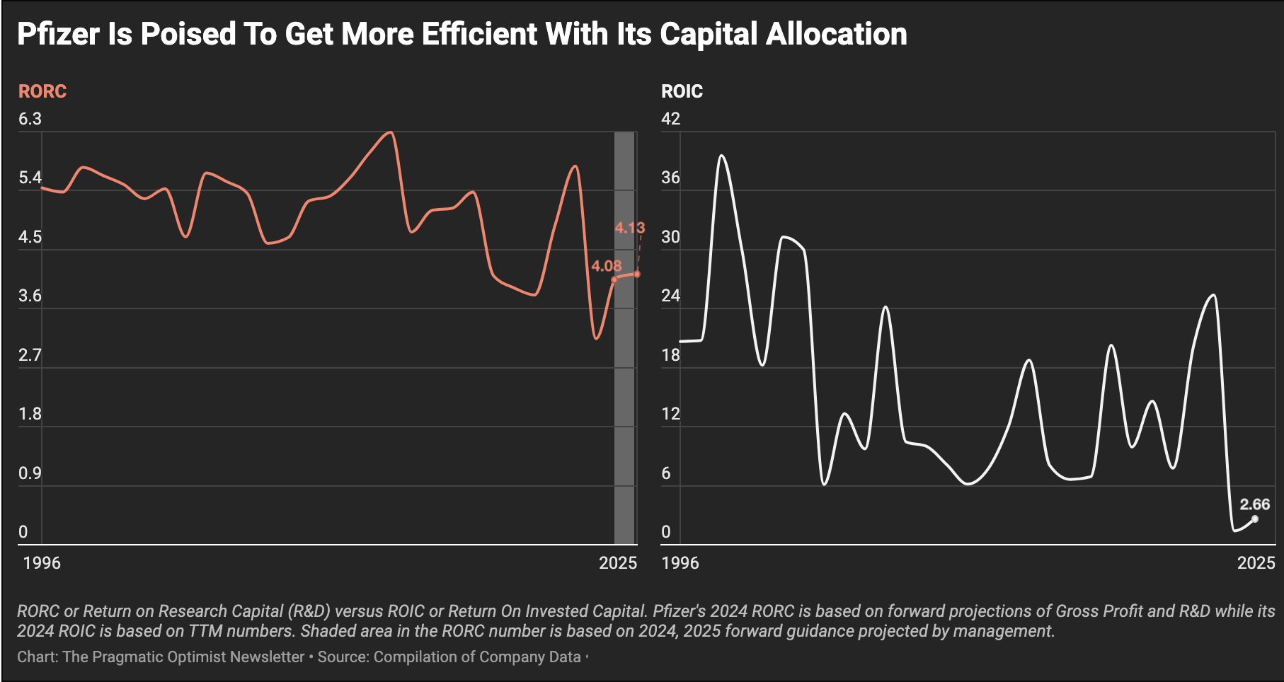 Unfortunately for Pfizer, the efficiency of those R&D investments and capital has been poor, leading to dismal returns on its investments. I monitor these investments with two metrics. One is the Return on Invested Capital or ROIC, that most investors are familiar with. The other is the Return on Research Capital, or RORC, which compares Pfizer’s gross profits to the previous year’s R&D expenses. With RORC, I try to observe if Pfizer was able to deliver higher revenues after adjusting for gross costs, based on the R&D expenses they made in the previous year at the very least.