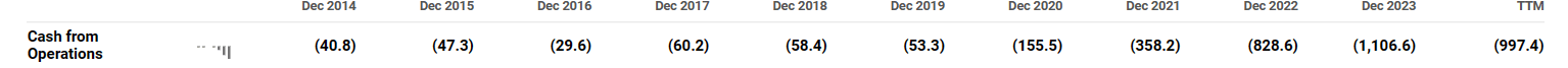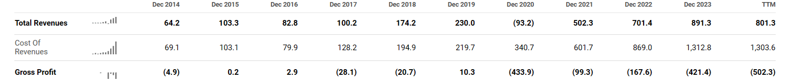Revenues for Plug were mostly stable for the first half of the last 10 year period, before some exponential growth. Also growing exponentially is Plug’s cost of revenues, meaning Plug’s gross profit is decidedly negative, and that’s before any other costs related to Plug’s business are factored in. This makes the following graphic rather unsurprising, though no less disappointing.