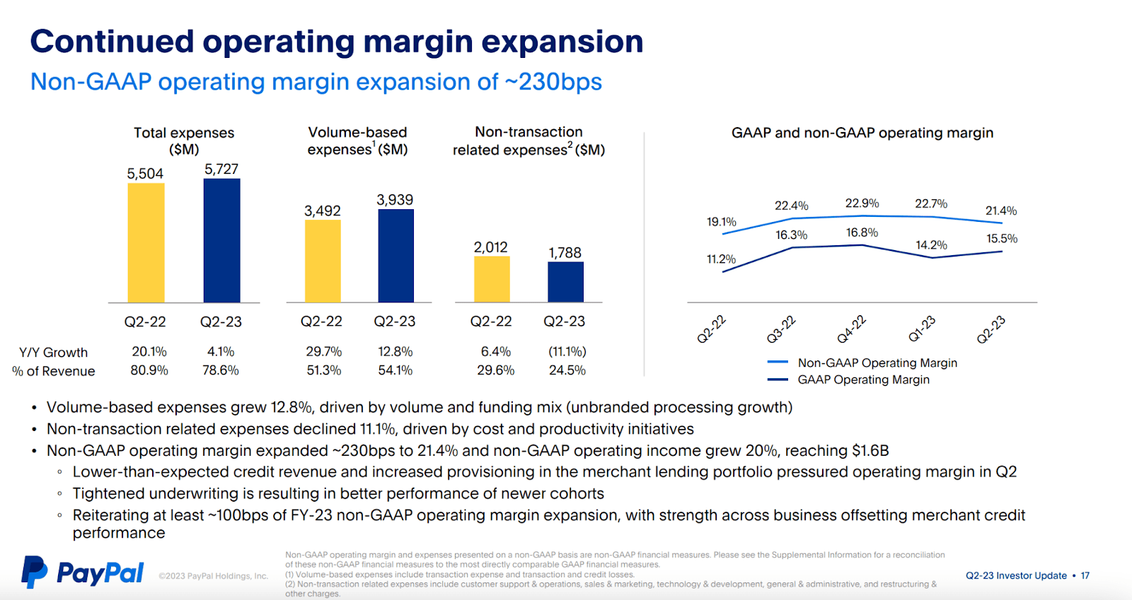 Interestingly, GAAP operating margin was higher, while non-GAAP came in lower. While PayPal has been able to reduce non-transaction expenses, total expenses and volume-based expenses have been climbing up.
