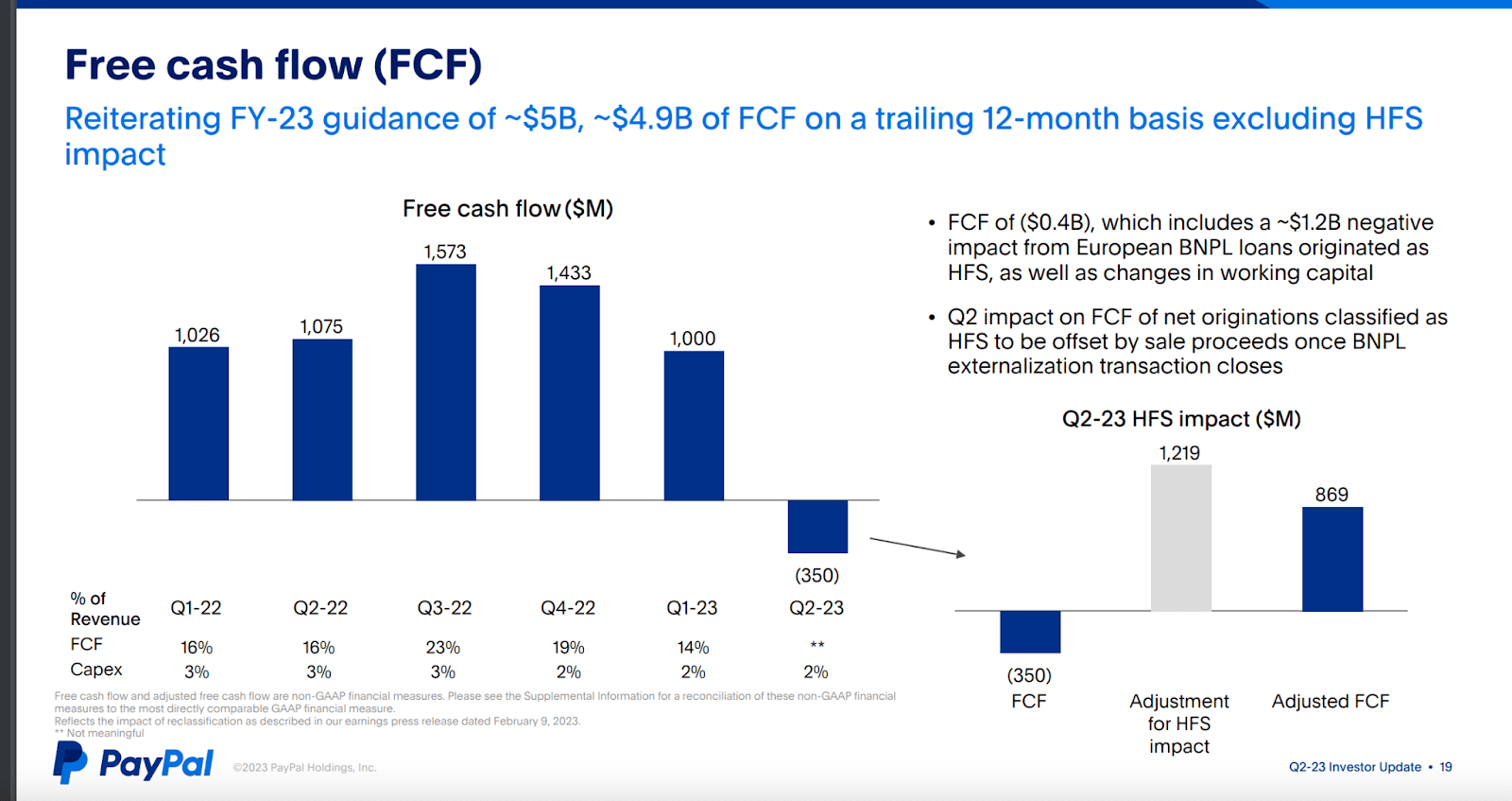 FCF was negative $0.4 billion due to the impact of $1.2 billion from European BNPL loans originated as held for sale (HFS). These are expected to be sold in the second half of the year. Excluding this charge, FCF would have been close to $4.9 billion on a trailing 12-month basis.
