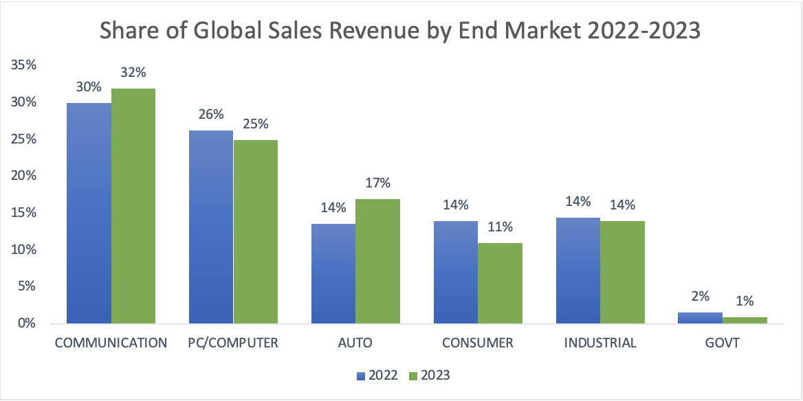 Qualcomm’s bet into the high-end automotive industry appears to be paying off as well. While the smartphone semiconductor market is nearing saturation, the booming automotive semiconductor is seeing high growth, experiencing the largest growth in share of chip sales in 2023.