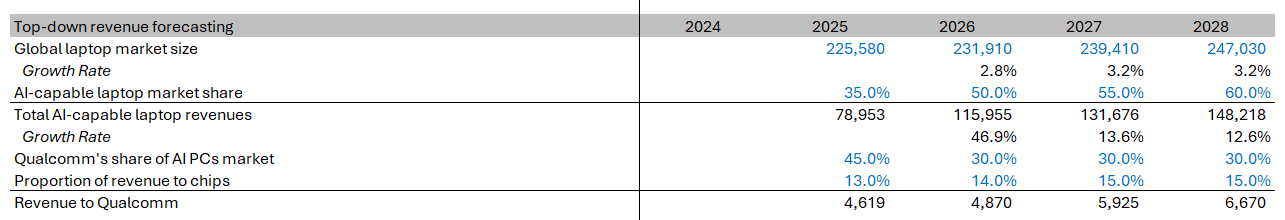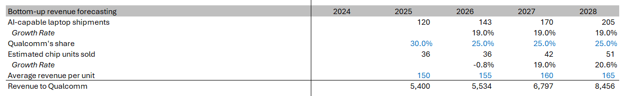 Using a bottom-up revenue forecasting model gives a similar conclusion. To forecast the volume of AI chips sold, I estimate the total quantity of AI-capable laptop shipments using market research from Canalys, which puts the quantity of shipments at more than 100 million in 2025, eventually reaching 205 million in 2028. This is corroborated by IDC’s projection of 167 million shipments in 2027. Already by Q4 2024, shipments of AI-capable PCs are expected to rise to around 20 million units, capturing over 25% of global PC shipments, which further makes me comfortable with projecting a high 120 million shipments starting in 2025 alone. With an estimated per unit cost of USD$150, I arrived at Qualcomm’s AI-related revenues.