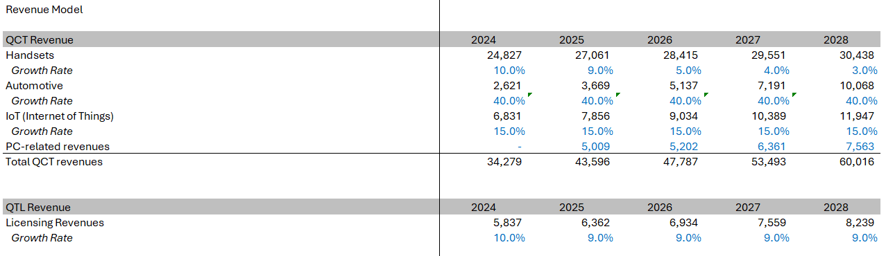 The expected CAGR of the total smartphone application processor (AP) market is only in the low single digits due to high smartphone saturation globally. However, the migration to newer 5G cellular devices and on-device generative AI adoption on premium smartphones may spur an upgrading cycle – something already seen in increased demand for MediaTek’s 5G chips. 5G and Gen AI present themselves as tailwinds for Qualcomm’s revenue, given QCOM’s established position supplying 5G modems to premium smartphone manufacturers; I would project Qualcomm’s smartphone chipset revenue to grow at high single digits.