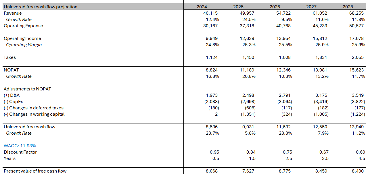 Historical operating margins for Qualcomm have been around 26%. Considering that pent-up pandemic demand drove margins to a high of 35.6% in 2022 and the smartphone market downturn in 2023 which caused a low 20% margin, I would expect a gradual return to a 26% margin, assisted by management’s cost-cutting efforts. Using a WACC of 11.93% according to GuruFocus, I discount cash flows.