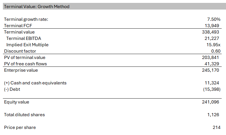 Qualcomm has a high long-term growth rate of 7.5%, considering the possibility of long-term growth in the automotive market and further 6G upgrading cycles. This puts Qualcomm’s exit multiple in line with its 5Y average EV/EBITDA of 16.0x. Summing terminal value and phase 1 cash flows to get the enterprise value, I take away net debt to obtain the equity value and an implied share price of $214.