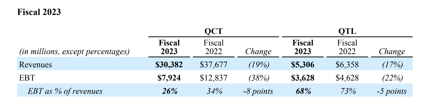 The QTL license business has produced ~$4 billion in EBT annually with a 70% margin while the chip business produces $10 billion in EBT at 30% margins. The chip sales have far lower margins, but the volumes add up to substantially more revenues and profits now.