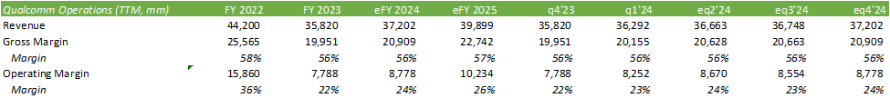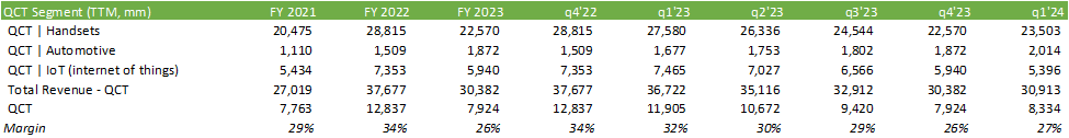 Considering trailing margins, QCT has been experiencing tighter margins. Management mentioned their headcount reduction to reel in costs, which should somewhat bolster margins going forward. The degree of the impact may not be significant enough to turn the ship around per se; however, q1’24 did show some improvement in margins when compared to the previous quarter.