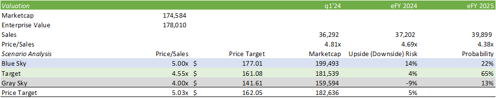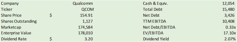 Qualcomm offers significant shareholder value in the form of buybacks and dividends. As of q1’24, Qualcomm has $4.4b remaining under their share repurchase program, offering significant flexibility for the firm to opportunistically repurchase shares. At the current share price, Qualcomm has roughly 28mm shares they can take off the float. Given my expectations for a relatively soft growth rate for eFY24 & eFY25, I do not anticipate Qualcomm to emphasize their share buybacks unless there is a significant pullback in the price per share. The firm has historically increased the dividend rate annually, so we may be able to model in some growth in the dividend rate for eFY24.