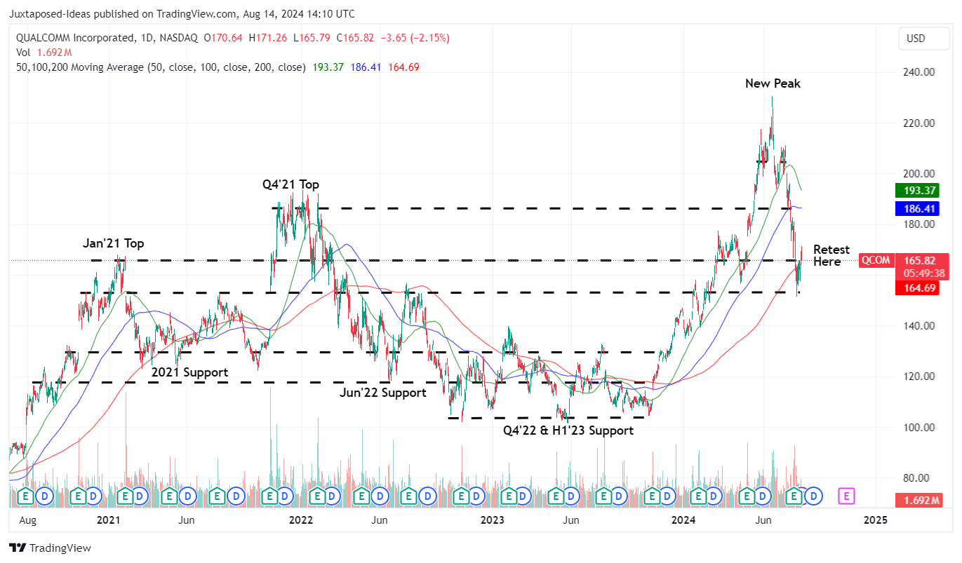 • QCOM’s AI-PC investment thesis shows promise with strong early sales of Snapdragon X Elite powered notebooks, aided by the growing design wins in handset/ automotive segments.