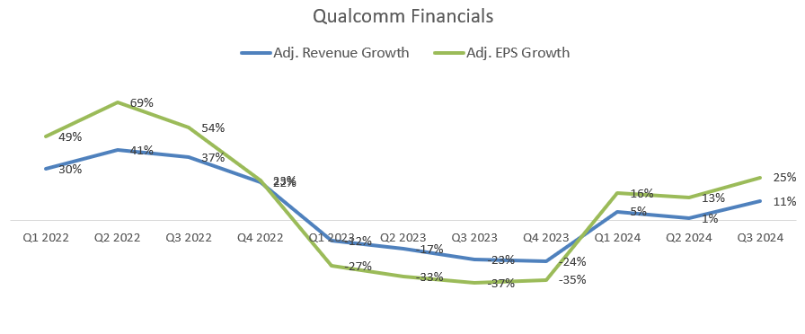 In Q3, Qualcomm delivered 11% growth in revenue and 25% growth in adjusted EPS, as depicted in the chart below.