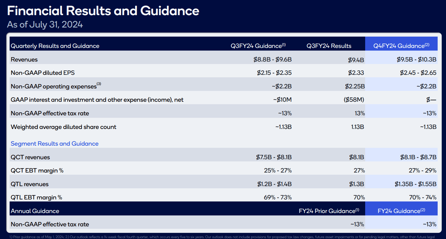 I published my “Sell” thesis on QUALCOMM Incorporated (NASDAQ:QCOM) in my previous coverage published in December 2023, expressing my concerns about Huawei’s 7-nanometer processor and Apple Inc.’s (AAPL) ongoing development of its own 5G modem chip. Qualcomm released its fiscal Q3 earnings on July 31st after the market close, with 11% growth in revenue and 25% growth in adjusted EPS growth. I don’t think AI PC and Handsets can ensure the company’s future growth, and Qualcomm has significant risks from Apple and export restrictions to China. I reiterate a “Sell” rating with a fair value of $150 per share.