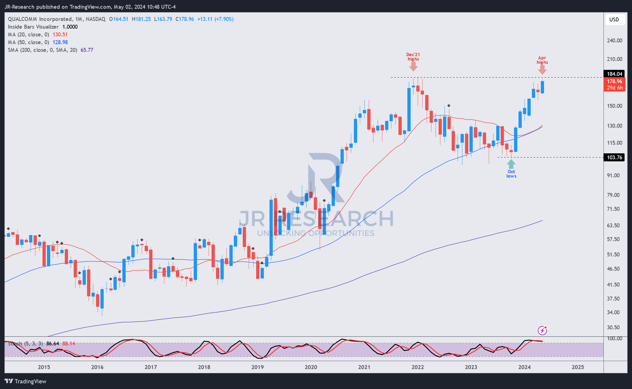 QCOM price chart (monthly, long-term, adjusted for dividends) (TradingView)